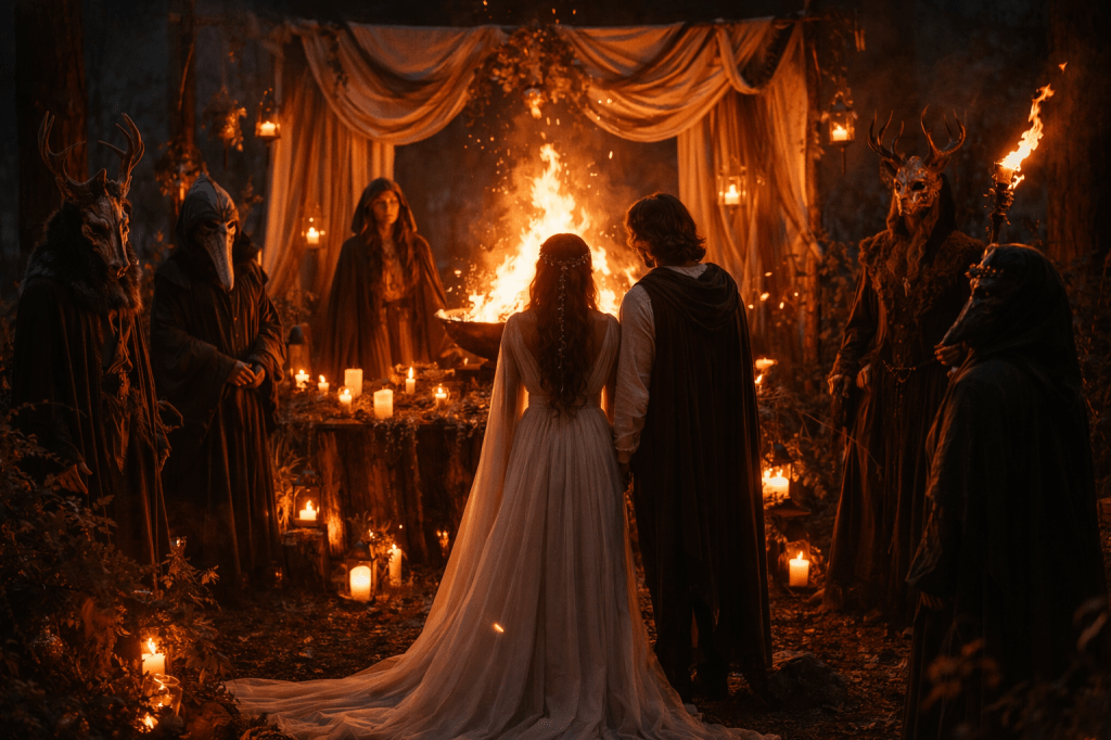 Ao entardecer, o festival dá lugar à celebração da união e da fertilidade com a recriação de um Casamento Celta, culminando na simbólica Boda de Titânia e Fausto, uma encenação ritual que evoca a ligação entre o humano e o natural, entre o visível e o invisível, num momento de celebração coletiva.